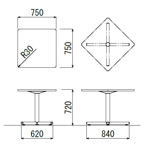 テーブルの外寸サイズは、幅750mm×奥行750mm×高さ720mmとなります。
