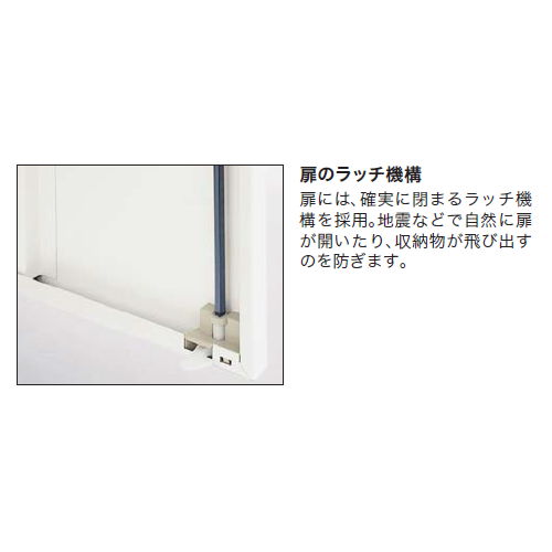 引き戸には、確実に閉まるラッチ機構を採用。地震などで自然に扉が開いたり収納物が飛び出すのを防ぎます。