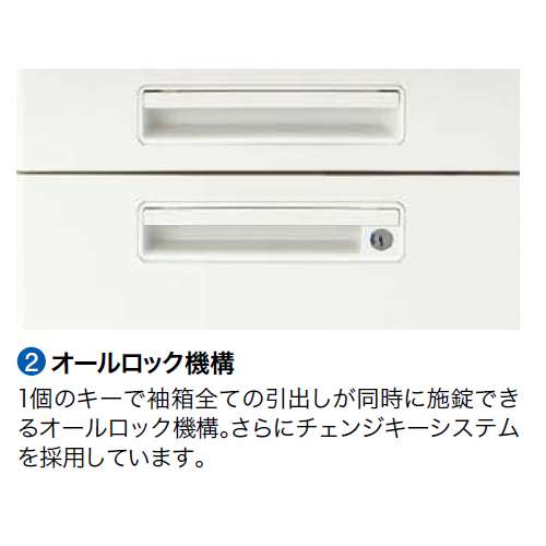 すべてのデスク袖箱には、1個のキーで袖箱すべての引き出しが同時に施錠することができるオールロック機構を採用。