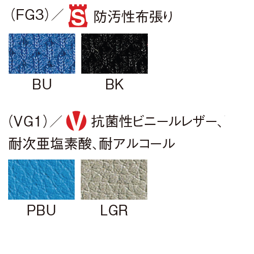 チェアの張地は、防汚性布張り(FG3)と、耐次亜塩素酸・抗菌性ビニールレザー張り(VG1)の2種類からお選びいただけます。